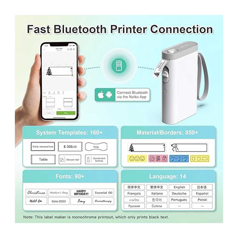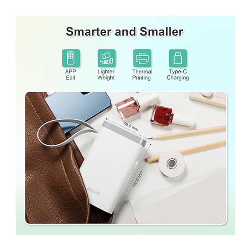 در مقایسه با چاپگرهای برچسب معمولی، محصولات ما تنها نصف وزن و اندازه آن‌ها هستند، کوچکتر، هوشمندتر و راحت‌تر برای کاربران. چاپگر برچسب بی‌سیم بلوتوثی قابل حمل است و می‌توان آن را در جیب خود قرار داد و در هر زمان و مکانی چاپ کرد. برای کیفیت چاپ بهتر، توصیه می‌کنیم از کاغذ برچسب حرارتی NELKO استفاده کنید.