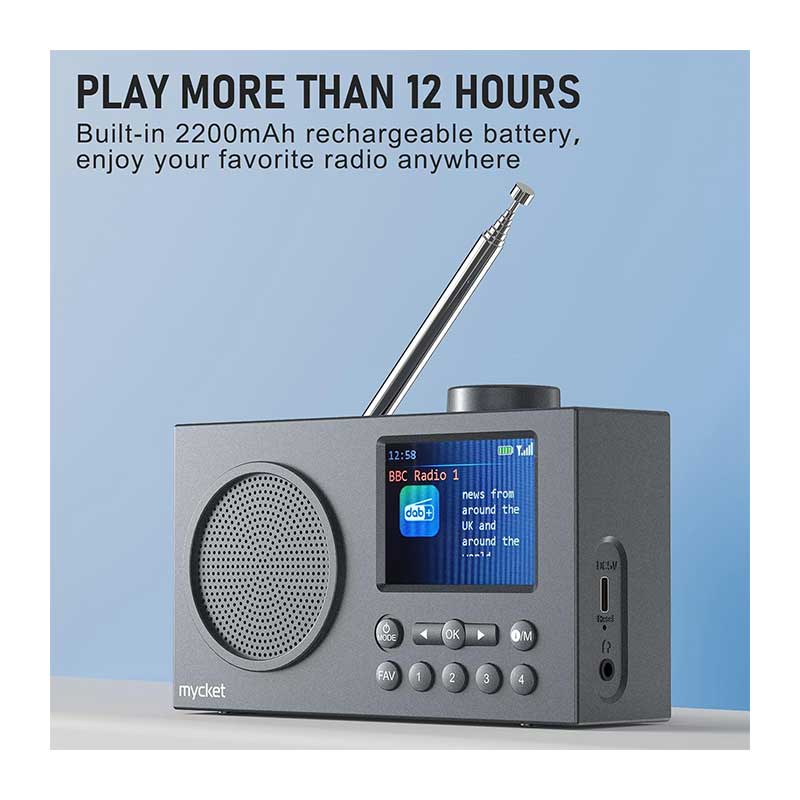 قابل شارژ با باتری ۲۲۰۰ میلیآمپر ساعت: این رادیوی قابل شارژ دارای باتری داخلی لیتیوم ۲۲۰۰ میلیآمپر ساعتی است که با شارژ ۲.۵ ساعته از طریق کابل USB همراه، تا ۱۲ ساعت قابل استفاده است. رادیوی قابل حمل Mycket DAB+ همراه سفر ایدهآل شما برای لذت بردن از ایستگاههای رادیویی مورد علاقه در هر مکان است.