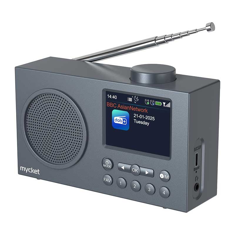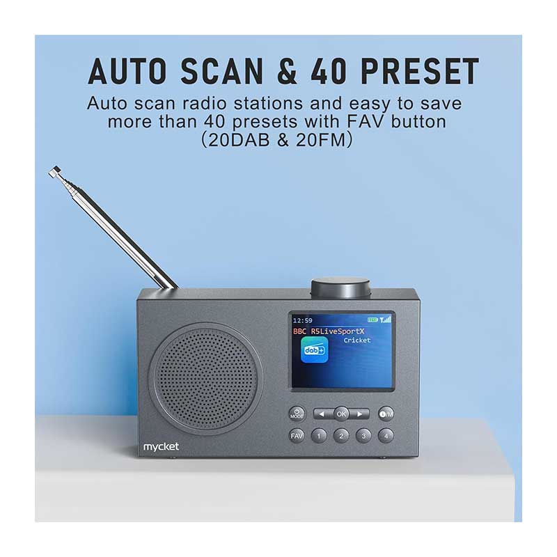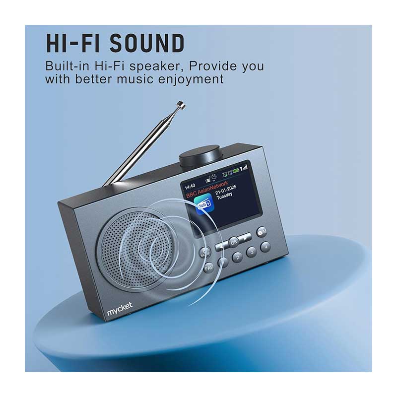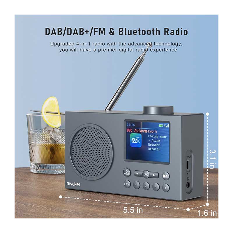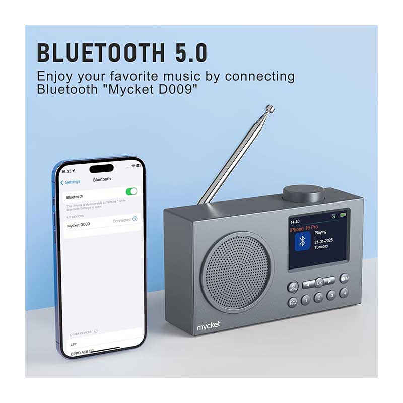 قابل حمل و مجهز به بلوتوث ۵.۰: به لطف طراحی باریک و جمعوجور، میتوانید رادیو را به راحتی در کولهپشتی یا چمدان خود قرار دهید – در باغ، آشپزخانه، سالن یا هنگام سفر – هر جایی که میخواهید موسیقی خود را گوش دهید، رادیوی قابل حمل Mycket DAB/DAB+/FM با بلوتوث آماده پخش موسیقی از طریق اتصال به گوشی یا تبلت شما است. این رادیو دارای جک هدفون نیز میباشد تا بتوانید با هدفون سیمی موسیقی گوش دهید بدون اینکه دیگران مزاحم شوند.
